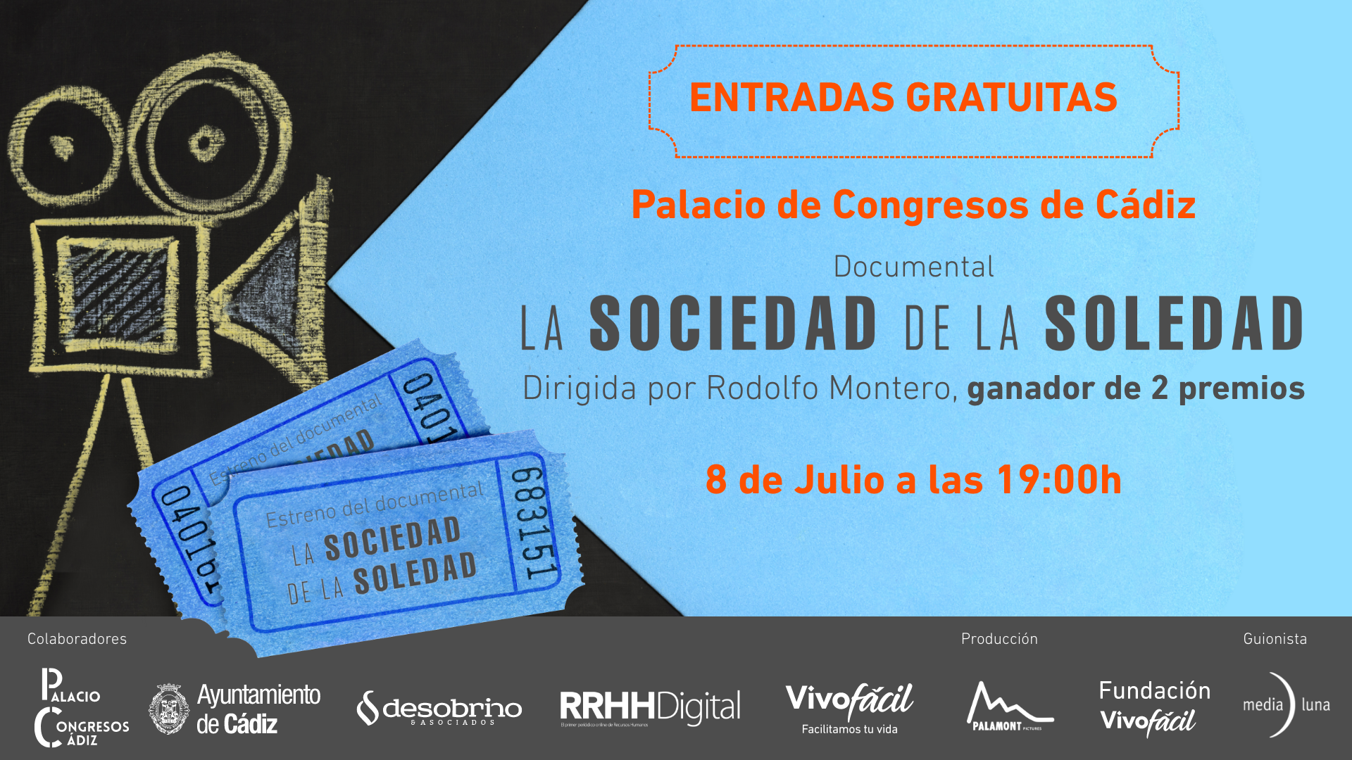 El próximo miércoles, 8 de octubre, a las 19:00h, el Palacio de Congresos de Cádiz acogerá la proyección del documental La sociedad de la soledad, una obra impulsada por la Fundación Vivofácil y dirigida por Rodolfo Montero, ganador de dos premios Goya, que visibiliza una de las grandes problemáticas de nuestro tiempo: la soledad no deseada.